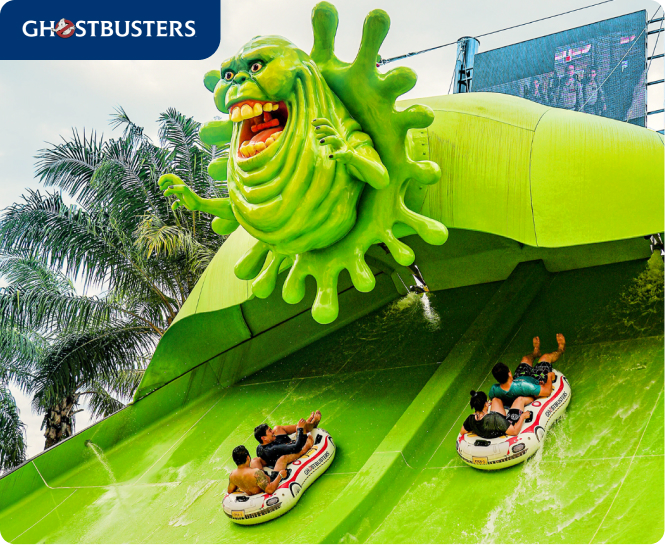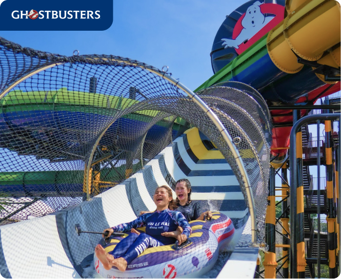 สำหรับผู้ที่ชอบความตื่นเต้นอะดรีนาลีนพลุ่งพล่านต้องมาลองเครื่องเล่นสไลเดอร์สุดมันส์เหนือธรรมชาติในธีม Ghostbusters แห่งแรกในเอเชีย! ก้าวลงแพยางพร้อมรับประสบการณ์ระทึก ลดเลี้ยวไปในความมืดมิดก่อนจะดิ่งลงสู่โดมน้ำขนาดใหญ่เพื่อเผชิญหน้ากับเจ้าผี Stay Puft สไลเดอร์ลูกกลมยักษ์แห่งแรกของโลกนี้จะทำให้คุณต้องกรี๊ดออกมาด้วยความสนุกสุดใจ!